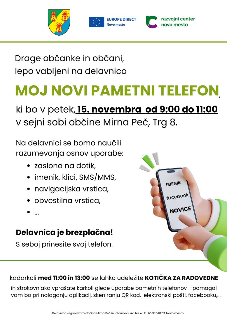 Drage občanke in občani, lepo vabljeni na delavnico MOJ NOVI PAMETNI TELEFON, ki bo v petek, 15. novembra 2024 od 9:00 do 11:00 v sejni sobi občine Mirna Peč, Trg 8.