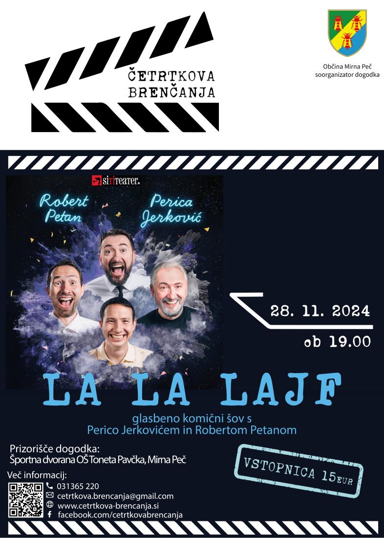 Brenčači smo se tokrat podali v komične vode. Vabimo na "La La Lajf", glasbeno-komični šov s Perico Jerkovićem in Robertom Petanom, ki bo v četrtek, 28. novembra, ob 19. uri v Športni dvorani pri Osnovni šoli Toneta Pavčka v Mirni Peči.