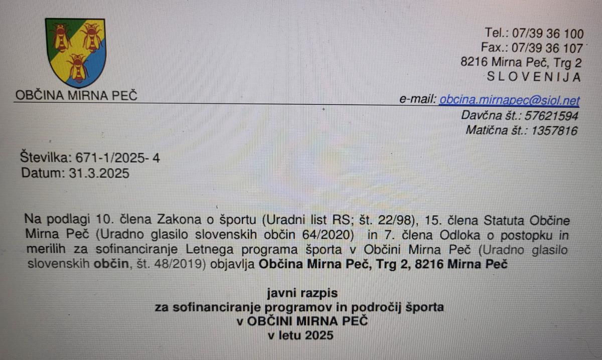Na podlagi 10. člena Zakona o športu (Uradni list RS; št. 22/98), 15. člena Statuta Občine Mirna Peč (Uradno glasilo slovenskih občin 64/2020) in 7. člena Odloka o postopku in merilih za sofinanciranje Letnega programa športa v Občini Mirna Peč (Uradno glasilo slovenskih občin, št. 48/2019) objavlja Občina Mirna Peč, Trg 2, 8216 Mirna Peč javni razpis za sofinanciranje programov in področij športa v OBČINI MIRNA PEČ v letu 2025.