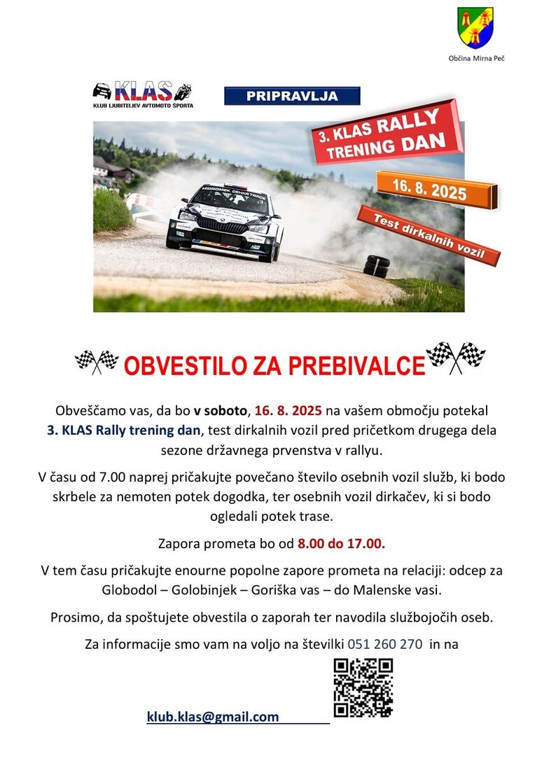 Obveščamo vas, da bo v soboto, 16. 8. 2025 na našem območju potekal 3. KLAS Rally trening dan, test dirkalnih vozil pred pričetkom drugega dela sezone državnega prvenstva v rallyu.
