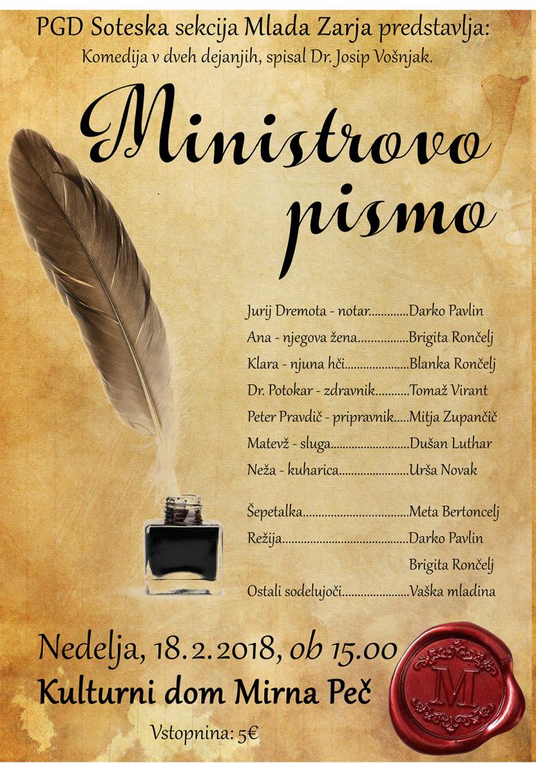 Prostovoljno gasilsko društvo Soteska, dramska sekcija Mlada zarja vabi na komedijo - Ministrovo pismo, v nedeljo, 18. februarja ob 15.00 uri v Kulturni dom Mirna Peč.