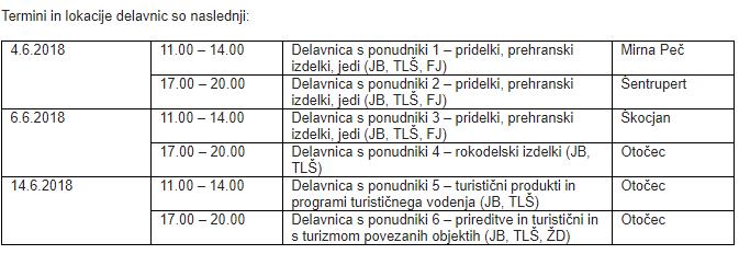 Izvedbo šestih strokovnih delavnic načrtujemo v mesecu maju. Tri delavnice s področja pridelkov, prehrambnih izdelkov in jedi bodo potekale v Mirni Peči, Škocjanu in Šentruperta, delavnice s področja rokodelskih izdelkov, prireditev in objektov, in turističnih produktov in vodenj, pa bodo potekale na Otočcu. Delavnice bodo odprte za vso zainteresirano javnost, termini delavnic pa bodo objavljeni v občinskem glasilu in na naši spletni strani, kjer bomo objavljali vse aktualne projektne novice.