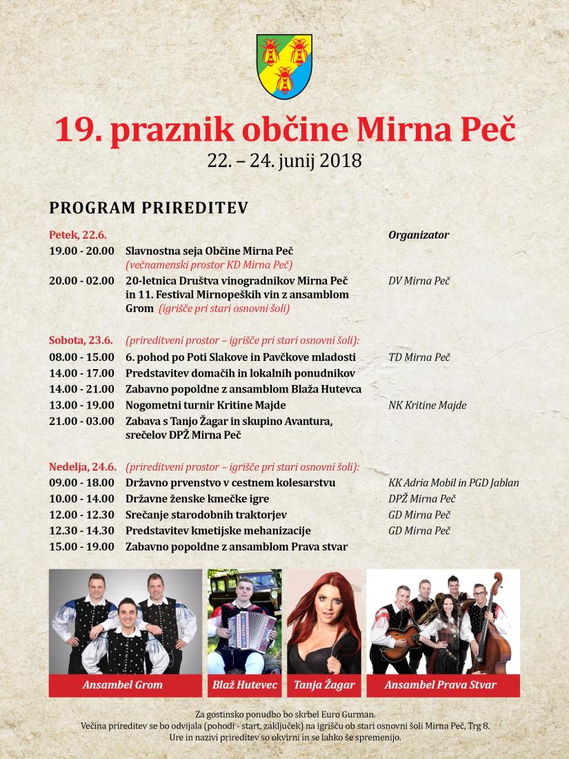 | 19:00 – 20:00 | Slavnostna seja Občine Mirna Peč | Večnamenski prostor KD Mirna Peč |