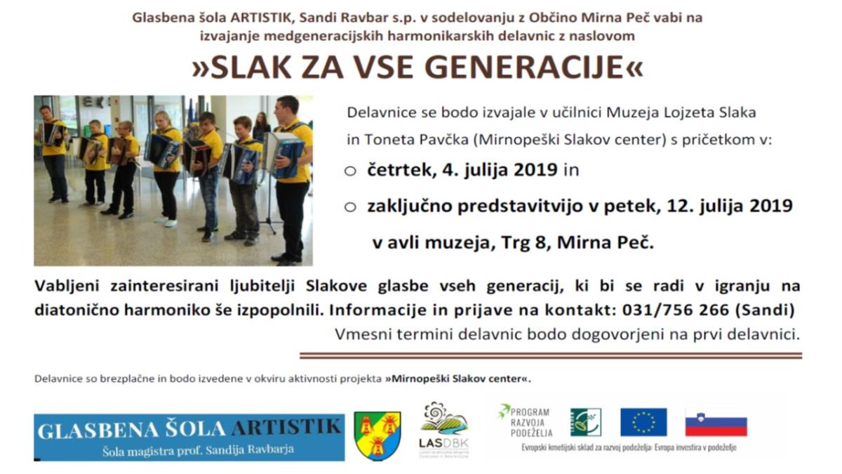 Glasbena šola ARTISTIK, Sandi Ravbar s.p. v sodelovanju z Občino Mirna Peč vabi na izvajanje medgeneracijskih harmonikarskih delavnic z naslovom »SLAK ZA VSE GENERACIJE«