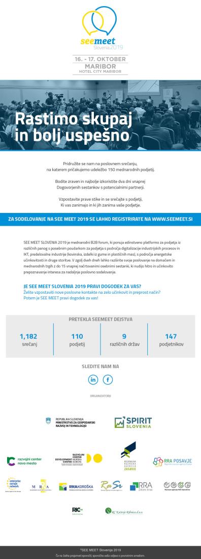 SeeMeet Slovenia 2019SeeMeet Slovenija 2019 je mednarodni B2B forum, ki ponuja edinstveno platformo za podjetja iz različnih panog s posebnim poudarkom za podjetja s področja digitalizacije industrijskih procesov in IKT, predelovalne industrije (kovinska, izdelki iz gume in plastičnih mas), s področja energetske učinkovitosti in druge storitve. V zgolj dveh dneh lahko razširite svoje poslovanje na domačem in mednarodnih trgih z do 15 vnaprej načrtovanimi osebnimi sestanki, ki nudijo hitro in učinkovito prepoznavanje interesa za nadaljnje poslovno sodelovanje.