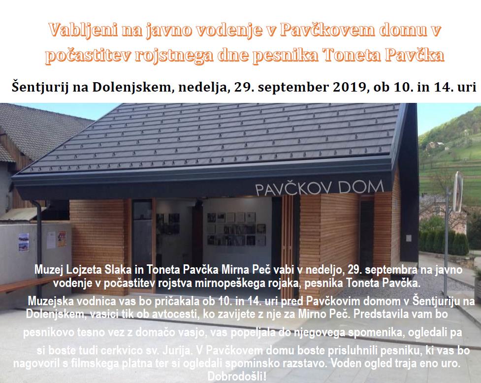 V počastitev rojstnega dne našega poeta, častnega občana Občine Mirna Peč, rojaka Toneta Pavčka, Muzej Lojzeta Slaka in Toneta Pavčka organizira dve javni vodenji v Pavčkovem domu v Šentjuriju na Dolenjskem tudi za posameznike, saj je ogled sicer možen le za organizirane skupine.