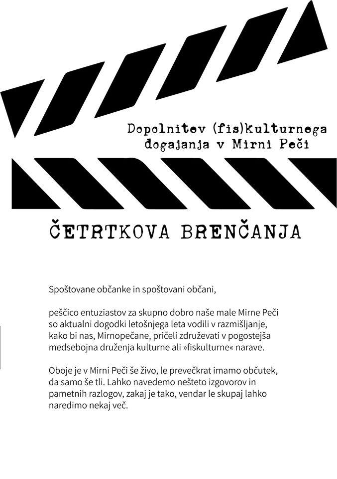 "Četrtkova brenčanja v Mirni Peči" kot dopolnitev dogajanja v Mirni Peči z druženjem kulturne ali "fiskulturne" narave pripravlja peščica entuziastov, katere so aktualni dogodki letošnjega leta vodili v razmišljanje, kako bi Mirnopečane pričeli združevati v pogostejša medsebojna druženja.