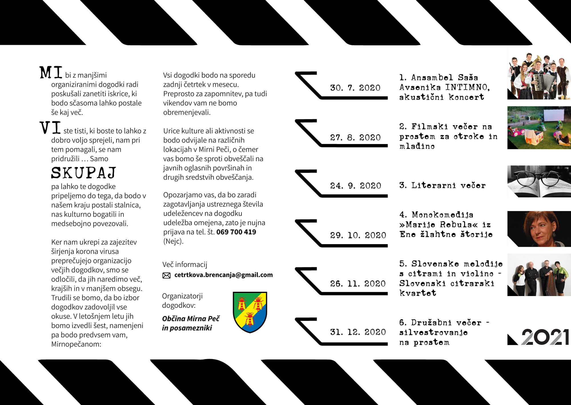 Vsi dogodki bodo na sporedu zadnji četrtek v mesecu, odvijali pa se bodo na različnih lokacijah v Mirni Peči, kar bo javno objavljeno.