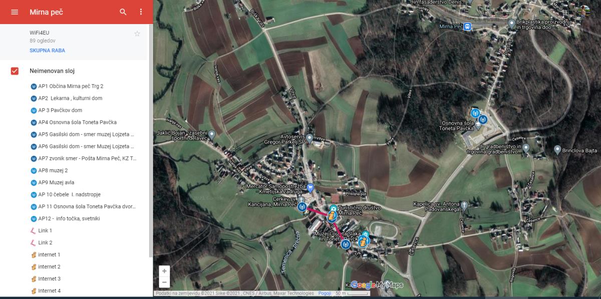 Omrežje je aktivno in ima na vseh lokacijah oznako WiFi4EU. Za registracijo na omrežje geslo ni potrebno. Po Mirni Peči je vzpostavljenih skupno 12 dostopkovnih točk, ki pokrivajo naslednja območja: