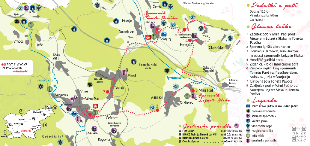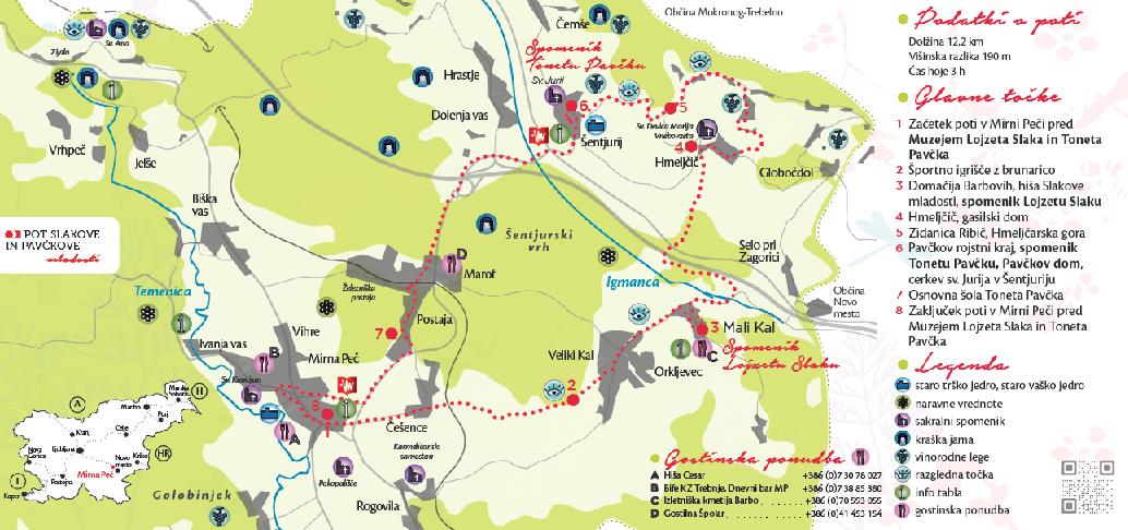 Vabljeni na 12 kilometrov dolgo pot, ki jo boste z zmernim korakom prehodili v treh urah. Začetek poti je pred kulturnim domom v Mirni Peči, nadaljuje se mimo spomenika NOB, rojstne hiše Ludvika Stariča, mimo stare šole proti Češnjicam. Zatem se nadaljuje po poljski in gozdni poti na Veliki Kal do brunarice. Tu se spusti na Mali Kal do domačije Barbovih – hiše Slakove mladosti, kjer stoji spomenik Lojzetu Slaku. Od tu skozi podvoz pot prečka AC in se vzpne do Hmeljčiča. Med vinorodnimi goricami se nadaljuje v smeri Šentjurija. Tu se ustavi ob Pavčkovem domu in njegovem spominskem obeležju. V Dolenji vasi pot ponovno prečka AC in se mimo gostiln Špolar in Ogulin spusti do Osnovne šole Toneta Pavčka. Zaključi se na izhodišču v Mirni Peči, pri muzeju Lojzeta Salak in Toneta Pavčka, Trg 8..