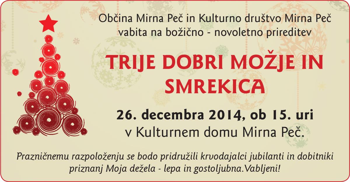 Občina Mirna Peč in Kulturno društvo vabita na božično - novoletno prireditev TRIJE DOBRI MOŽJE IN SMREKICA, ki bo v petek, 26. decembra 2014 ob 15. uri v Kulturnem domu Mirna Peč. Vabljeni!