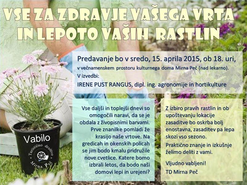 Turistično društvo Mirna Peč vabi na predavanje z naslovom "Vse za zdravje vašega vrta in lepoto vaših rastlin". Predavanje bo v sredo, 15. aprila 2015, ob 18.00 uri v večnamenskem prostoru kulturnega doma Mirna Peč (nad lekarno).