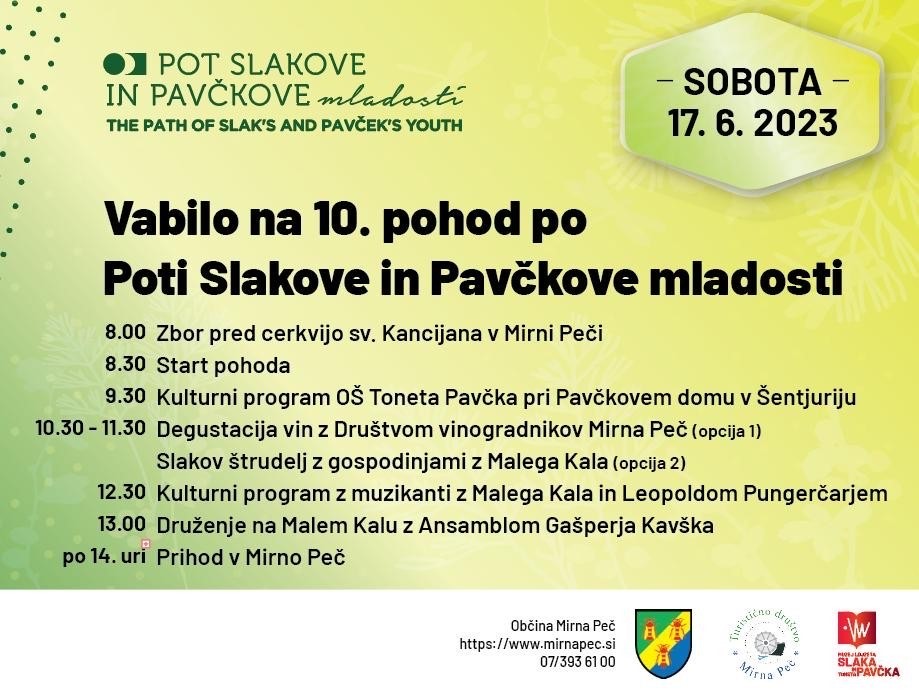 Kulturno društvo Četrtkova brenčanja v Mirni Peči v soboto, 17. junija, vabi na edinstven dogodek - jubilejni 10. pohod po Poti Slakove in Pavčkove mladosti, ki ga organiziramo v sodelovanju z Občino Mirna Peč, lokalnimi društvi, občani in Osnovno šolo Toneta Pavčka.