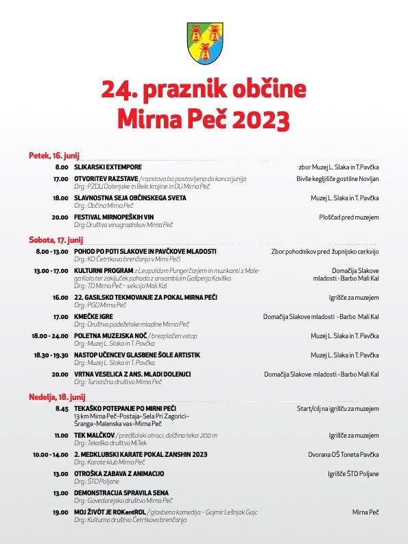 Tako, zdaj veste in je zagotovo – brenčaško krasno in “špasno” se bomo imeli na začetku poletja. V sklopu praznika Občine Mirna Peč bomo skupaj brenčali najprej v soboto, 17. junija, ko bomo med 8. in 14. uro veselo pohajkovali po (obrnjeni) Poti Slakove in Pavčkove mladosti, in nato še v nedeljo, 18. junija, ob 19. uri, ko bomo večer zaključili z dobro glasbo in obilico smeha. Celoten program občinskega praznika je pripet spodaj. |