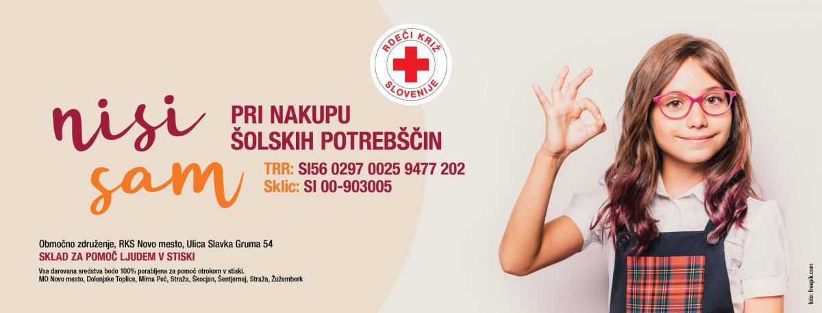 Na Območnem združenju RKS Novo mesto pričakujemo, da bomo pred začetkom šolskega leta pomagali od 250-300 otrokom iz socialno šibkih družin pri nakupu šolskih potrebščin. Zato zbiramo sredstva z akcijo Nisi sam-pri nakupu šolskih potrebščin, radi bi zbrali 30.000 eur. Prepričani smo, da nam bo uspelo zbrati dovolj sredstev, da bomo lahko pomagali vsem otrok in jim na ta način olajšali šolske dni.
