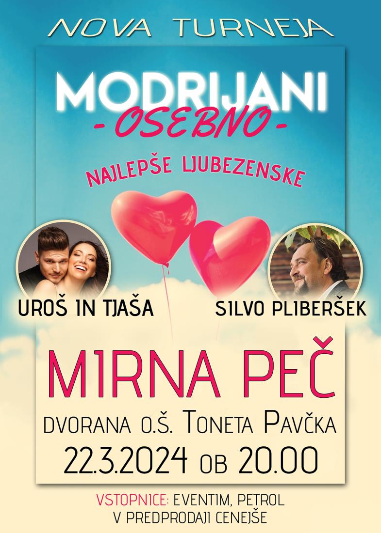 Modrijani smo pripravili povsem novo turnejo Modrijani osebno z naslovom Najlepše ljubezenske. Tokrat vas bomo razvajali z izbranimi ljubezenskimi pesmimi in s posebnimi gosti. Modrijanom se bodo na turneji pridružili Uroš in Tjaša ter Silvo Pliberšek. Osebne in zabavne zgodbe, najlepše ljubezenske pesmi ter posebne izvedbe pesmi znova vabijo vse ljubitelje domače glasbe in večglasnega petja.