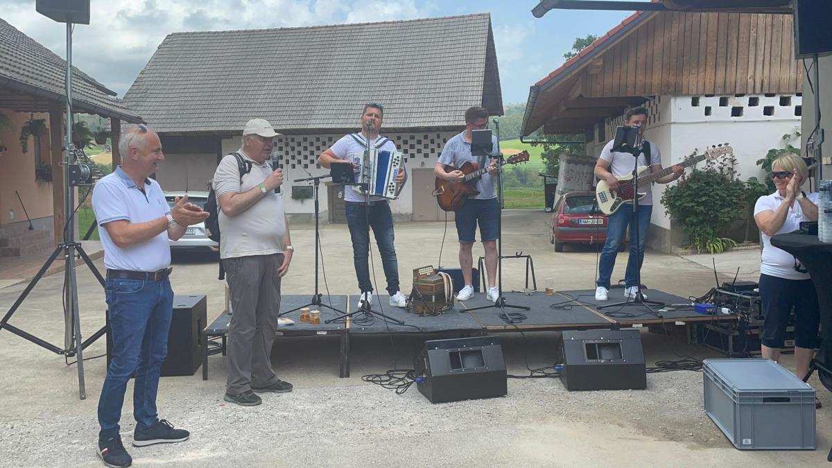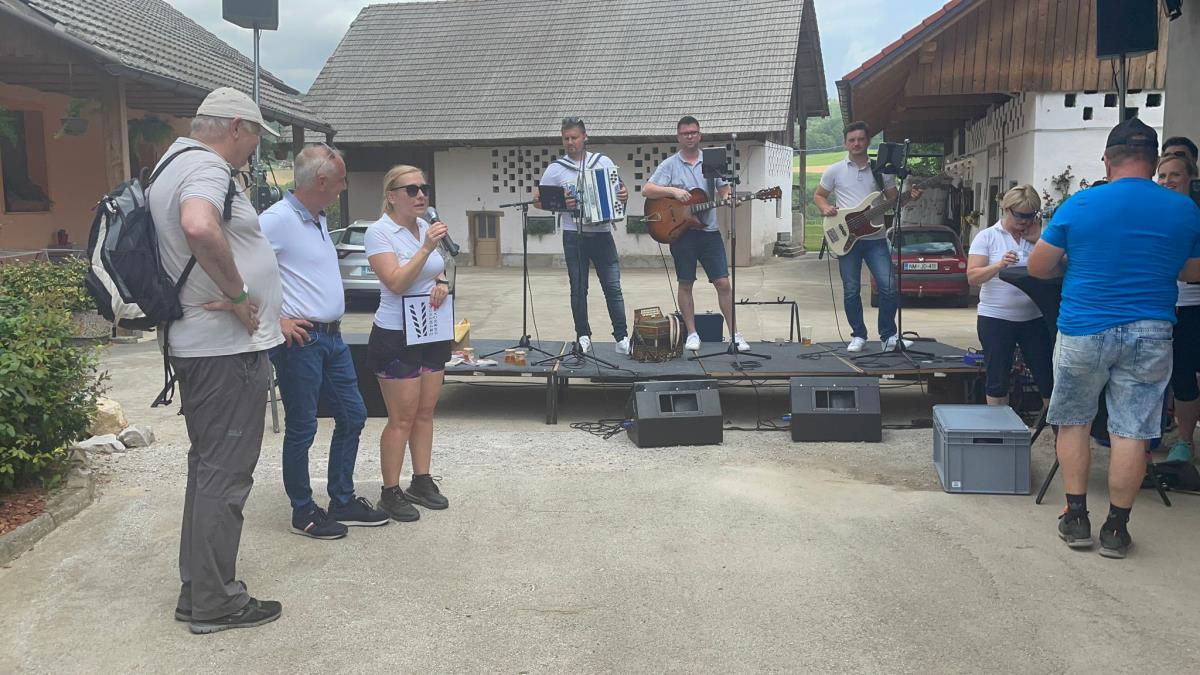 Pot nas je vodila naprej na Hmeljčarsko goro, kjer so nas v zidanici Miklič pričakali vinogradniki z žlahtno mirnopeško kapljico in pridne podeželske žene s kulinaričnimi domačimi dobrotami. Ob napitnicah Moškega pevskega zbora Rožmarin smo uživali v hrani in pijači ter lepih pogledih na okoliške griče, vinograde, polja in gozdove.