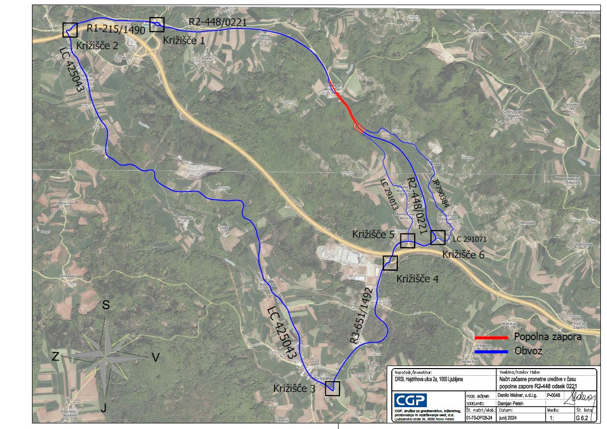 Obvoz bo urejen v smeri naselij Grm – Ponikve – Mirna Peč, kot je to razvidno iz priložene slike. Uporabnikom cest predlagamo, da pri načrtovanju svojih poti upoštevajo dejstvo, da se bo lahko zaradi obvoza čas vožnje občutno podaljšal.